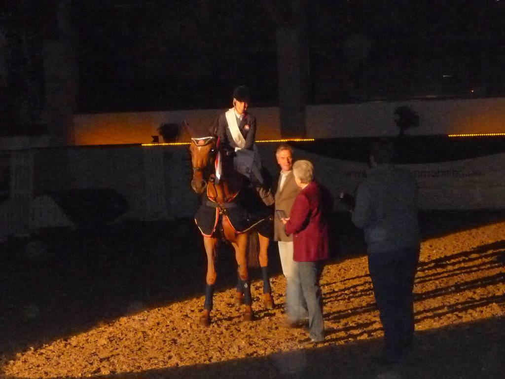 Sieg im Six-Bar-Springen über 1,90 Meter bei traumhafter Nachtkulisse und voller Tribühne in Gut Ising. Glückwünsche wurden überbracht von Bundesministerin für Arbeit "Ursula von der Leyen"