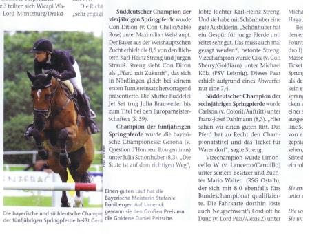 Ciao Piccolo BS gewinnt das Stilspringen der Kl. L mit WN 8,5 (Abt. 1) und Ziro Percent mit WN 8,4 (Abt.2). Die Springpferde der Kl. M* beendet Ciao Piccolo BS mit dem 3ten Platz (WN 8,1) und Ziro Percent mit Platz 5 (WN 8,0). Arizona bleibt in beiden M* fehlerfrei (Platz 5). Gerona platzierte sich ebenfalls in beiden Springpferdeprüfungen der Kl. A** und L (Platz 3 und 4) Palatino und Celina bleiben auch zweimal fehlerfrei in Springen der Kl. L (WN 8,0 und Platz 6).