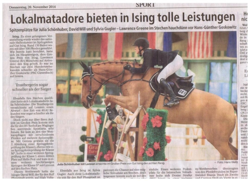 Freitag Zoltingen: Hello Pezi gewinnt die Springpferde A** mit WN 8,5 und Gerona wird mit 7,9 Dritte. Ranshofen: Meine 7-jährige Stute Arizona platziert sich mit einem fehlerfrein Ritt im Springen über 1,35 Meter.